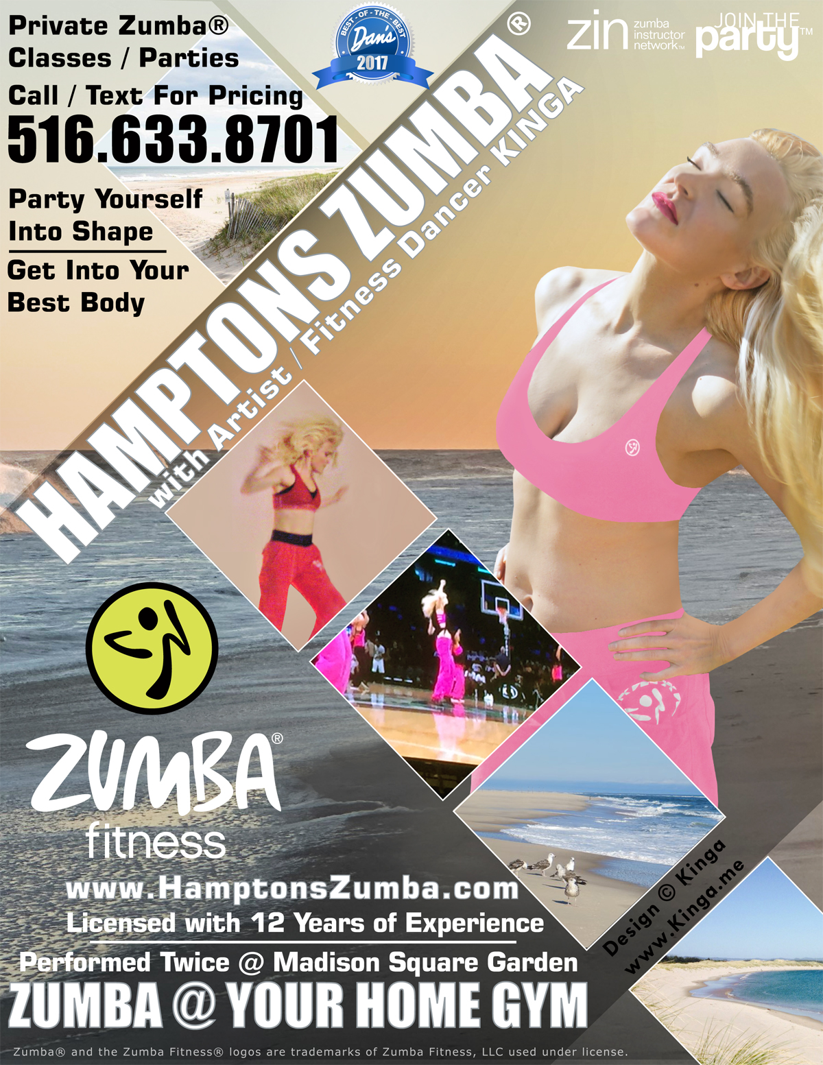Zumba® Dance Fitness in the Hamptons Long Island New York with European-American artist/fitness dancer Kinga presenting high-energy cardio, charismatic dance fitness classes, a calorie-incinerating cardio workout focusing on weight loss and body toning disguised as a dance party. Learn how to move your body feminine supreme with burning charisma. Become part of the ongoing fun of getting-into and staying-in shape! I invite you to step out of the realm of the grey-every-day for an hour of shapin' while shakin' and dance all negativity away. Looking forward to meeting you!